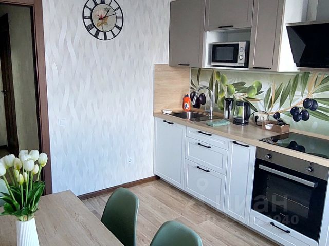 Также есть полный кухонный гарнитур, холодильник, микроволновка, индукционная плита, духовка, необходимый набор посуды, электр.чайник, чай и сладкий гостинец, предусмотрен водонагреватель. Из кухни выход на большую лоджию с прекрасным видом на лесопарк и мечеть.