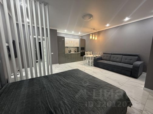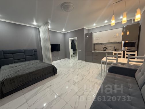 Сдается стильная студия с современным ремонтом на 17 этаже. В квартире выполнен ремонт, что создает уютную атмосферу. Просторная гостиная зона оборудована шкафами и диваном, а также имеется обеденный стол с двумя стульями. Кухня оснащена необходимой техникой: холодильник, микроволновая печь и стиральная машина. Из кухни выход на застекленный балкон с красивым видом на городские пейзажи. Ванная комната совмещенная, оформлена в светлых тонах и оборудована ванной. В коридоре предусмотрены вместительные шкафы для хранения вещей.
