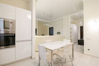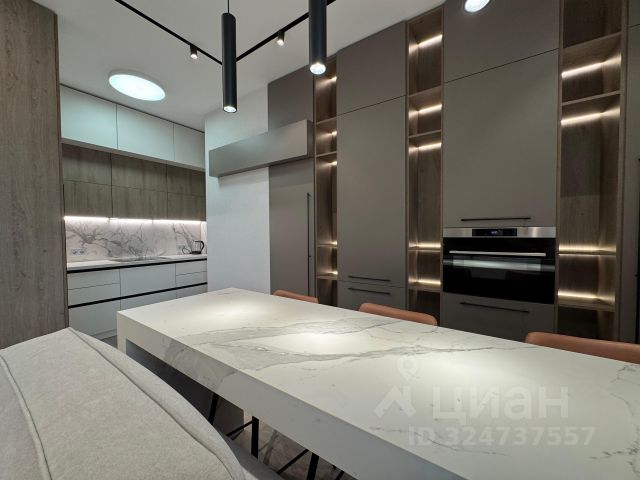 Стильный кухонный гарнитур, оснащён варочной панелью, вытяжкой, духовым шкафом, микроволновой печью, чайником и холодильником, а также имеется весьма вместительный шкаф купе