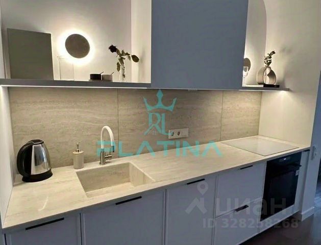 ПРО КВАРТИРУ: Стильный кухонный гарнитур, оснащён варочной панелью, вытяжкой, духовым шкафом, микроволновой печью, чайником холодильником, а также имеется весьма вместительная гардеробная кладовая, можно оборудовать в гардеробную