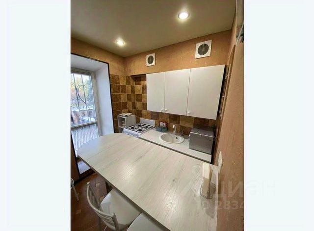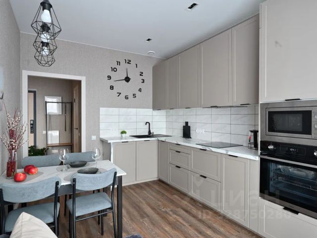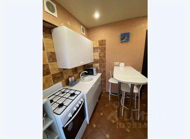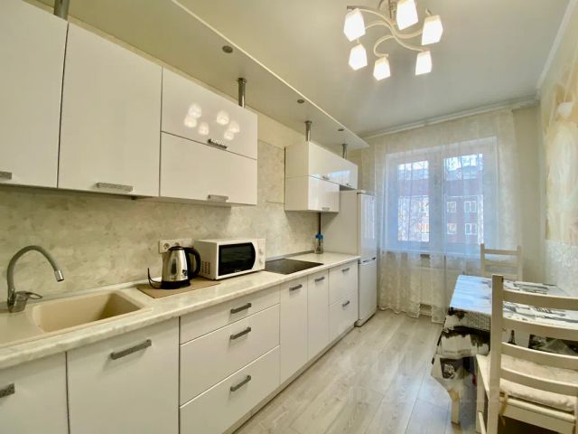 Кухня со всей необходимой бытовой техникой и посудой. Есть диван для 2 гостей